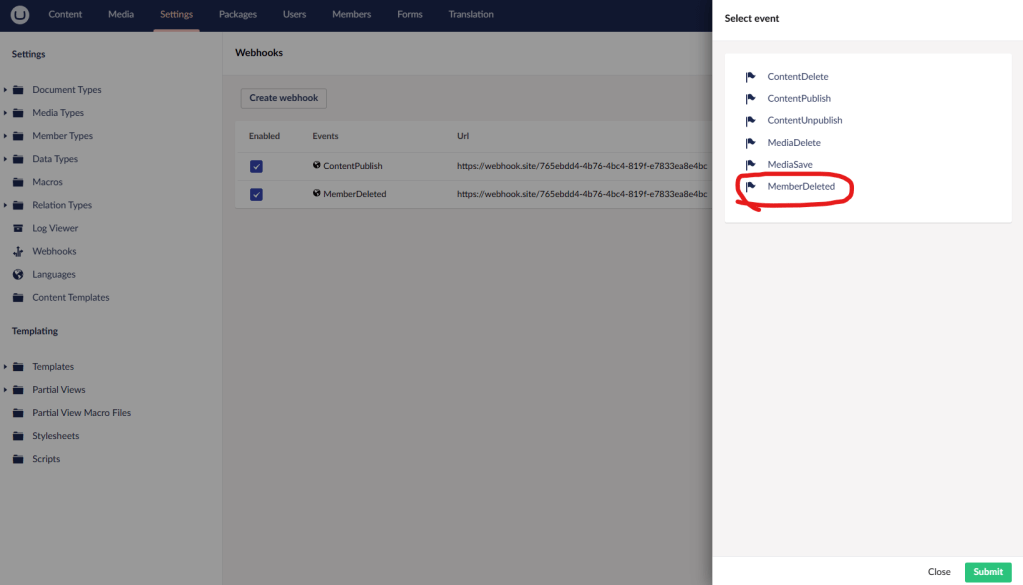 As you can see in the Umbraco backoffice I have a new event I can be notified and send out to a Webhook URL.